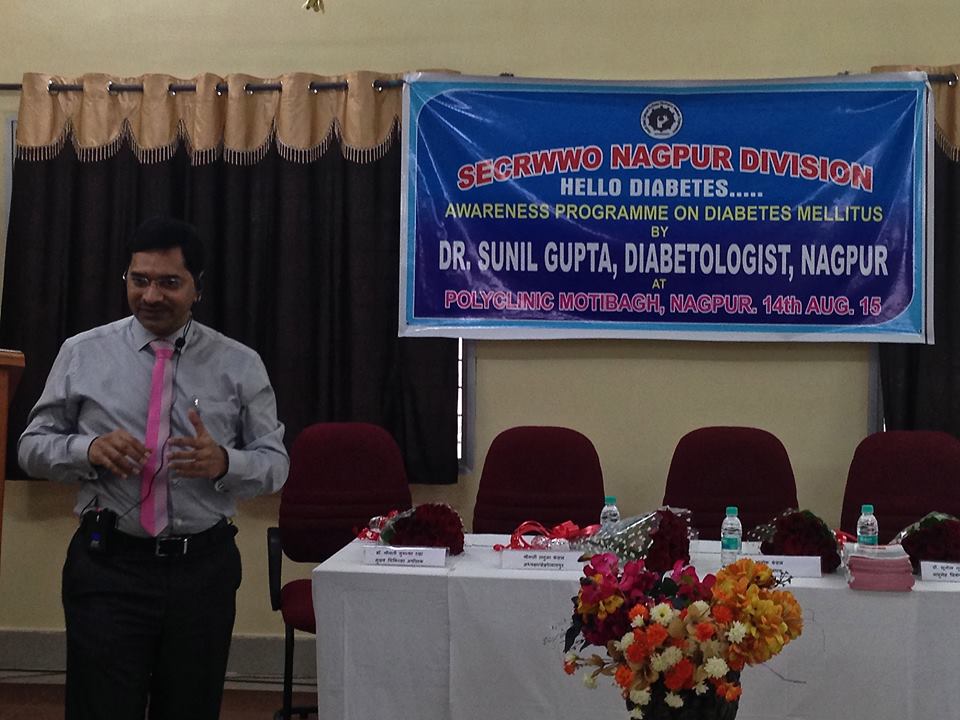 Dr Sunil Gupta delivering lecture on ” Hello Diabetes Awareness Program” at Polyclinic Hospital, Motibagh, Nagpur, organized by South East Central Zone Railways on 14th August 2015.